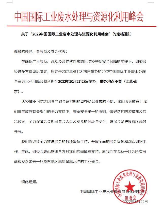 關于“2022中國國際工業廢水處理與資源化利用峰會”的定檔通知